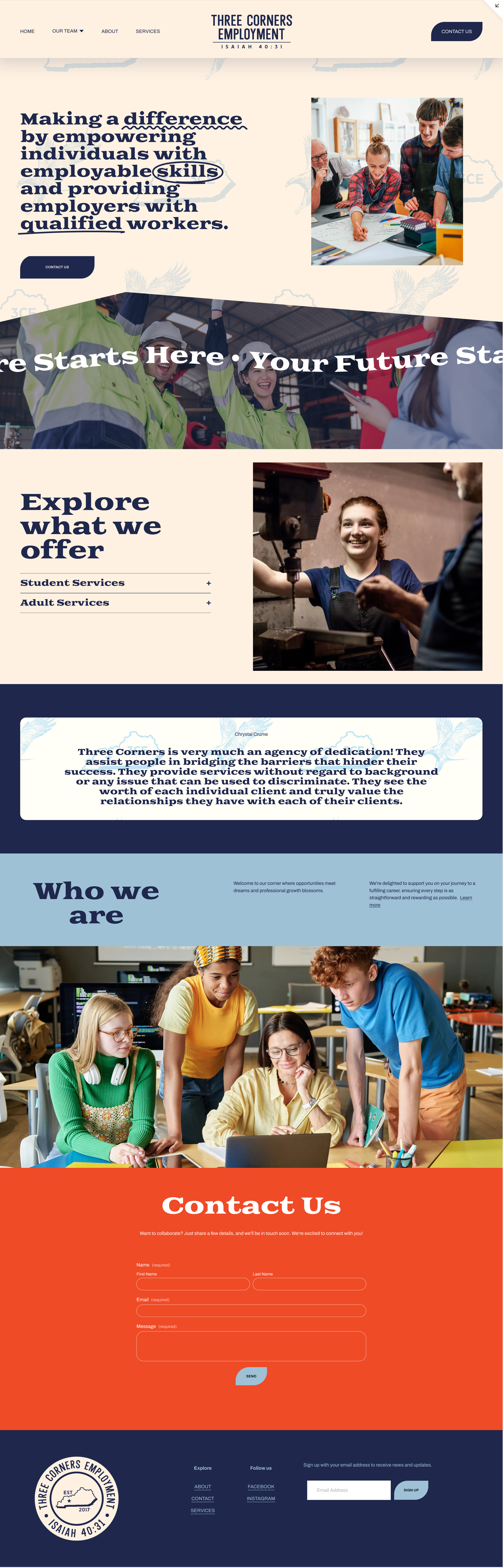 I completed a full rebrand that included a new logo system, color palette, typography, employee badges, print collateral, and a full website designed to present their services clearly and confidently. With limited photography and content, I designed layouts and iconography that made the brand feel inviting and easy to understand, both online and in print. The final identity gives Three Corners Employment a warm, community-centered presence with visuals that support their mission and grow alongside their programs.