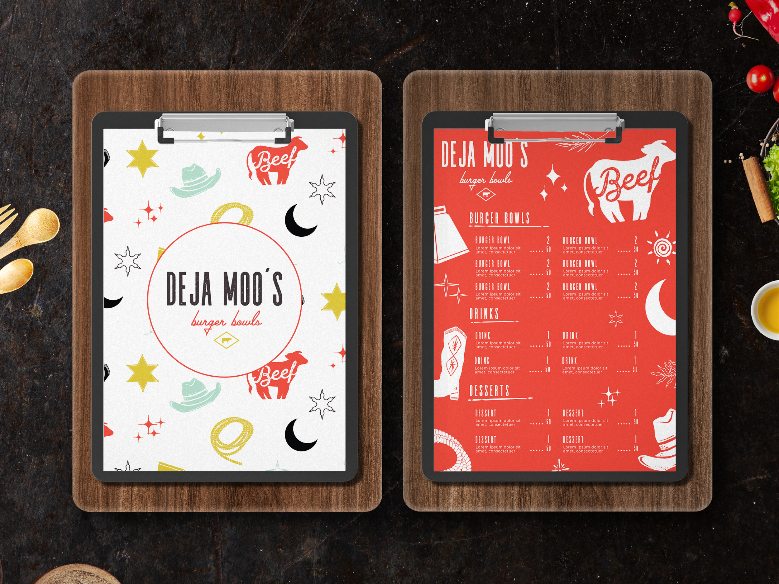 Deja Moo began as a playful, Southern-inspired burger truck concept branded by Oliver Creative. Ada Oliver, the studio owner, built the core visual identity; full of rustic charm, bright colors, and that wink of personality you expect from a name like Deja Moo. Once the direction was set, I stepped in to extend her work into the practical, everyday pieces a food truck depends on. Because their budget leaned toward easily sourced materials, our approach centered around stamp-friendly designs that stayed bold, legible, and fun even in one-color applications.